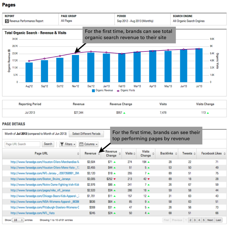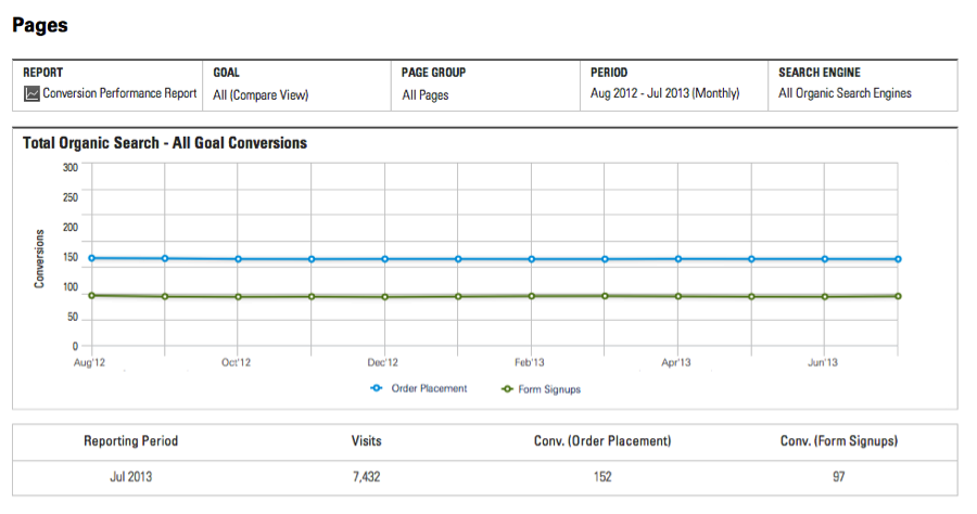 Page Groups – View organic search revenue at a page level, or page group level (such as grouping pages for a particular business unit), or site-wide across all pages.