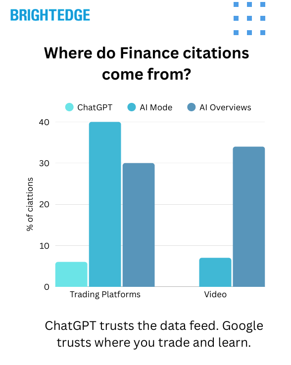 Three Different Trust Philosophies: ChatGPT trusts financial data aggregators (70%+). AI Mode trusts trading platforms (40% — 7x higher than ChatGPT). AI Overviews trusts consumer education and video (34%). Not a two-way split — a three-way divergence.