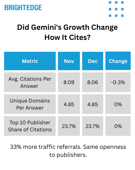 When AI platforms scale rapidly, there's a concern that they'll compress answers, reduce citations, or concentrate traffic to fewer publishers. Gemini didn't do any of that.