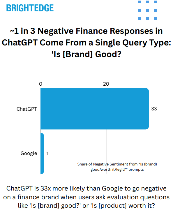 | "Is X Good?" Dominates ChatGPT Negativity | Evaluation queries drive ~33% of all ChatGPT negative finance sentiment — and ChatGPT is 33x more likely than Google to go negative on these queries. |