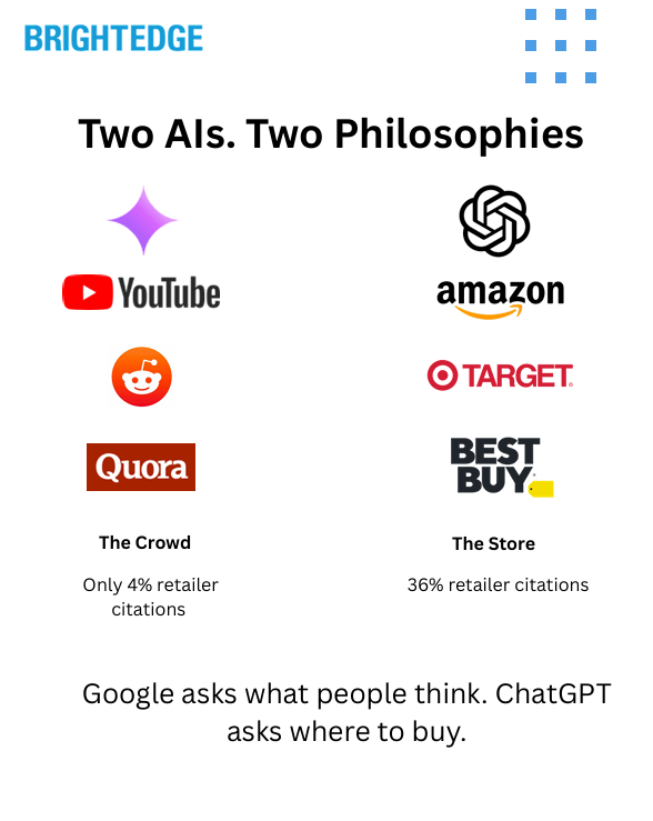 - The Source Hierarchy: Google leads with YouTube/Reddit/Quora; ChatGPT leads with Amazon/Target/Walmart
